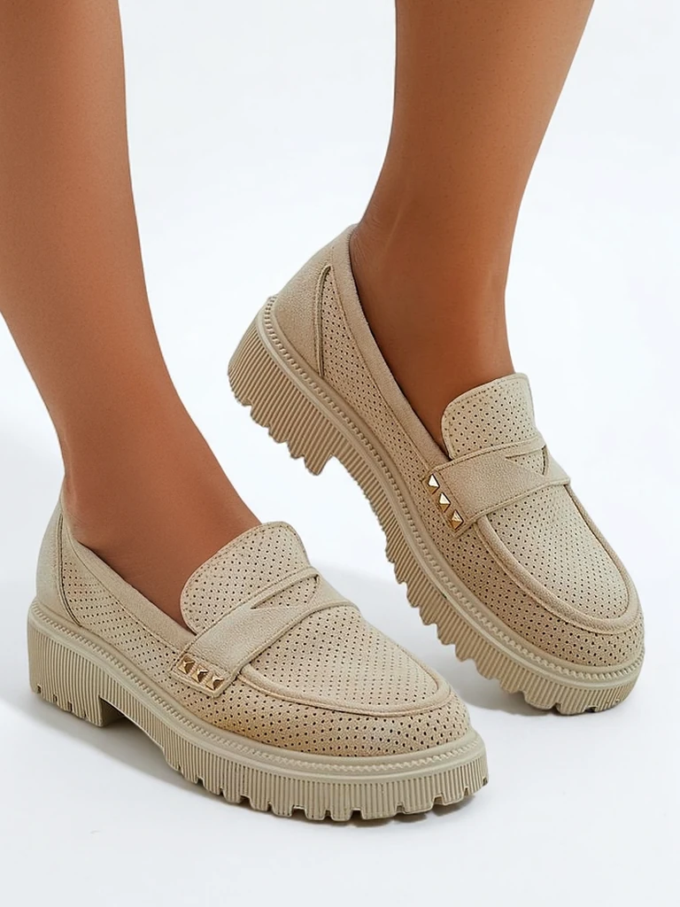 - Light women's moccasins on a flat sole. The model is casual in style and is made of eco-friendly suede leather, with an eco-friendly leather insole. Perfect for spring outfits!.