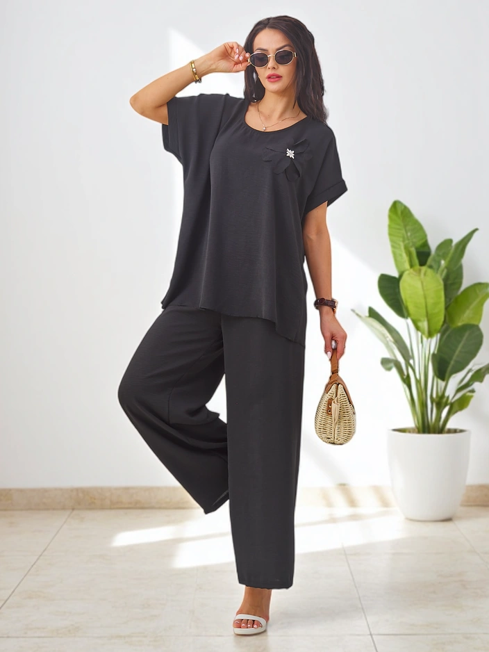 Royalfashion Women's set with short sleeves, decorative flower, and wide pants