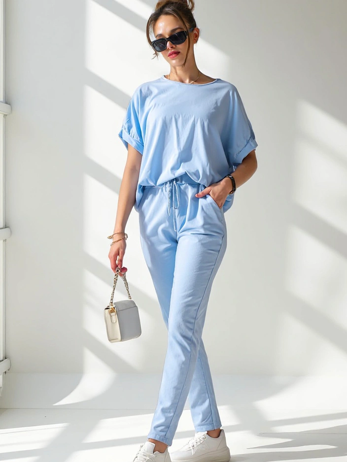 • Women's casual set made of pleasant fabric. The blouse is pull-over style, has short sleeves and a round neckline. Straight trousers with an elastic waistband. Perfect for those who value comfort.