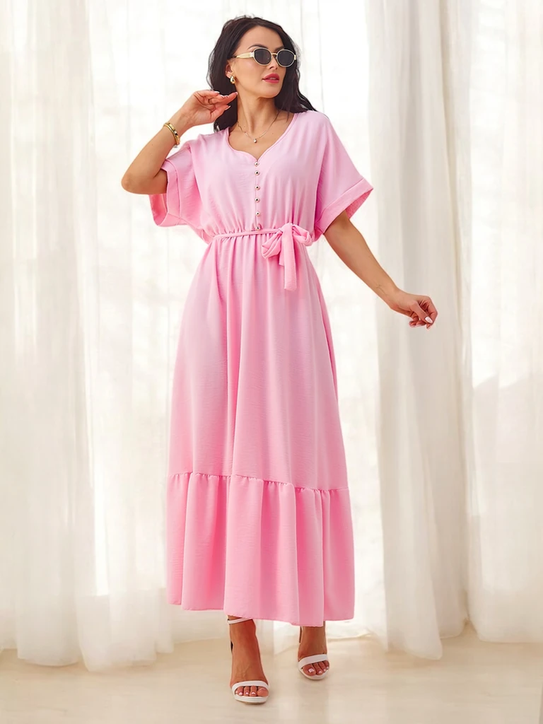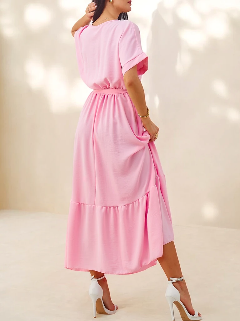 - Women's midi dress with short sleeves, decorative buttons, a belt, and a V-neck is an elegant and feminine option for any occasion. It highlights the silhouette, combining a classic cut with fashionable details.