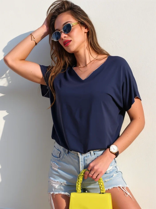 - Viscose women's blouse with short sleeves and glitter finish – light, shiny, and full of subtle sparkle, perfect for evening outings.