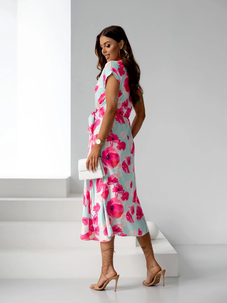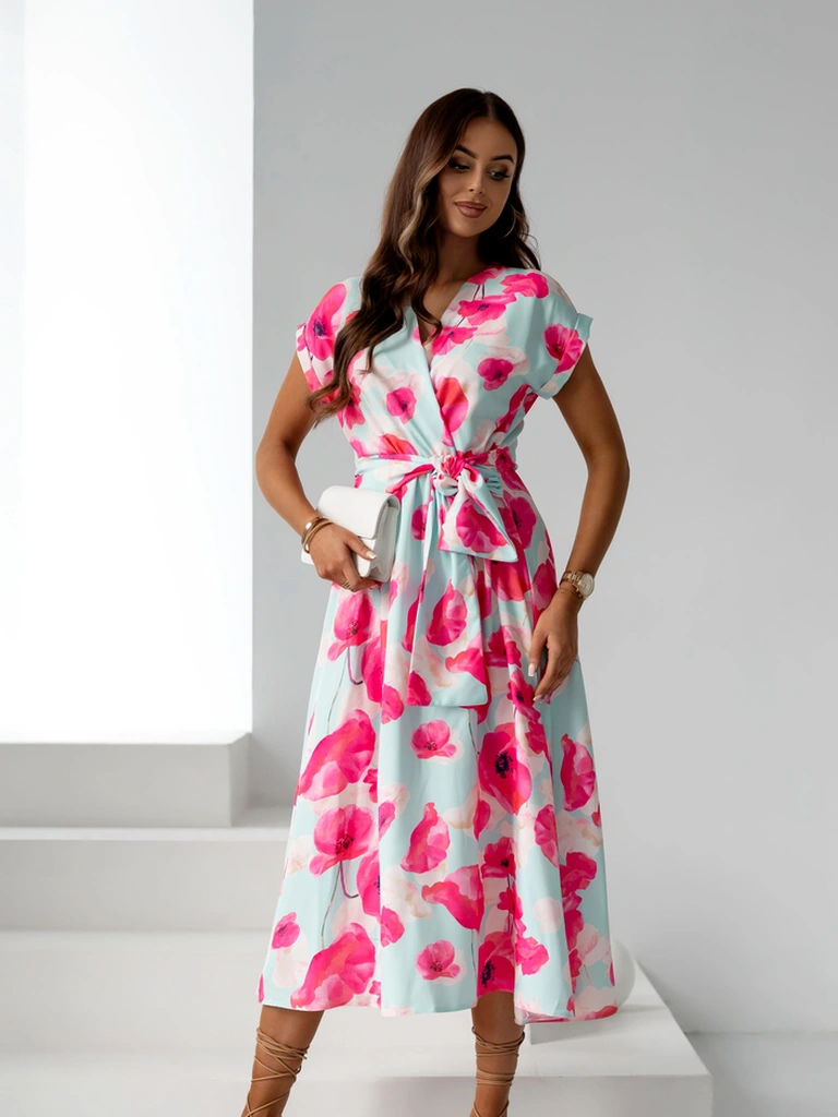 - Women's midi dress with short sleeves and wrap neckline, adorned with spring flowers – light, elegant, and perfect for warm days.