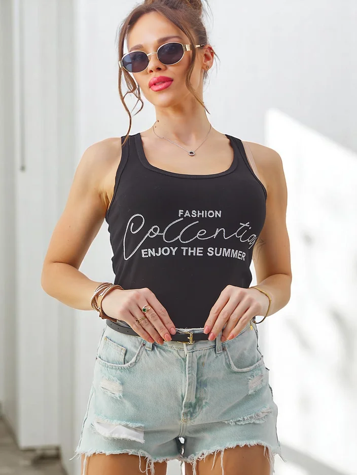 - Women's cotton tank top with straps featuring unique writings that combines comfort with trendy design. Light and breathable, perfect for summer days and casual outfits.