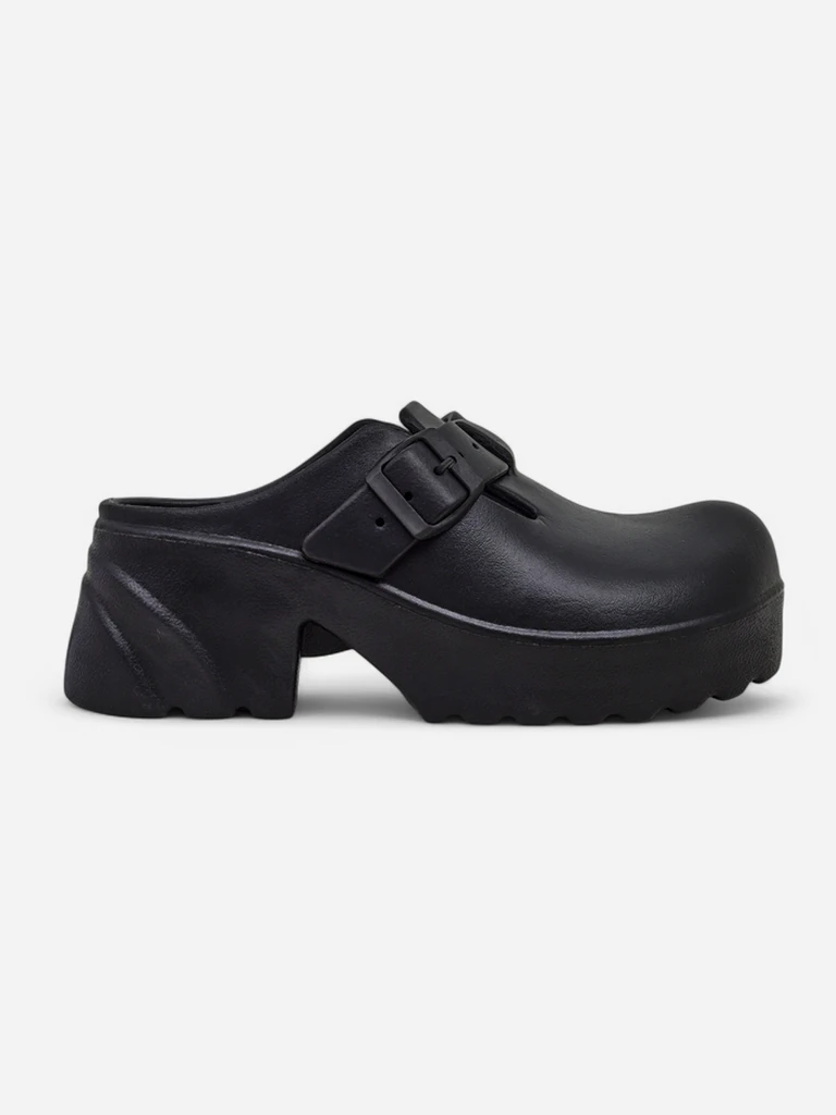 - Highlight your summer style and enjoy comfort with these heeled sandals. The model is made of rubber plastic. Decorated with a round toe. The platform is adorned with buckles. They are the perfect choice for summer days!