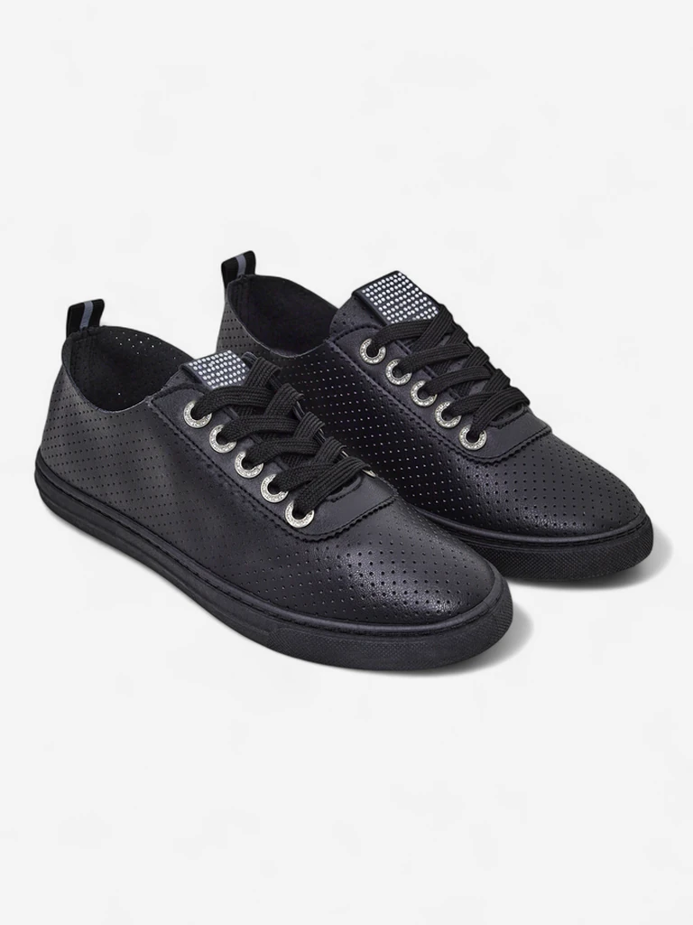 - Women's perforated sports sneakers made of eco-leather. The insole is fabric. Model with a flat sole. Lace-up upper, embellished with rhinestones. They will match perfectly with everyday outfits!