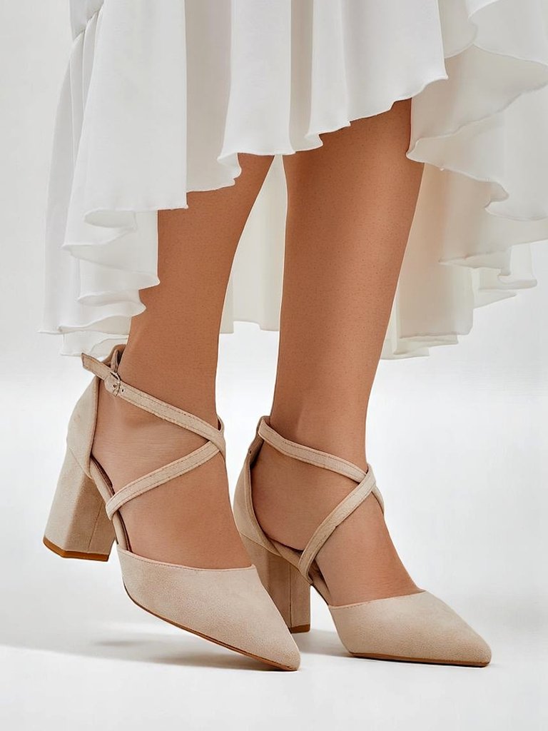 - Elegant women’s block-heeled pumps made of eco suede. The interior of the shoe is lined with eco leather, and the pointed toe adds elegance! Additionally, decorative straps!