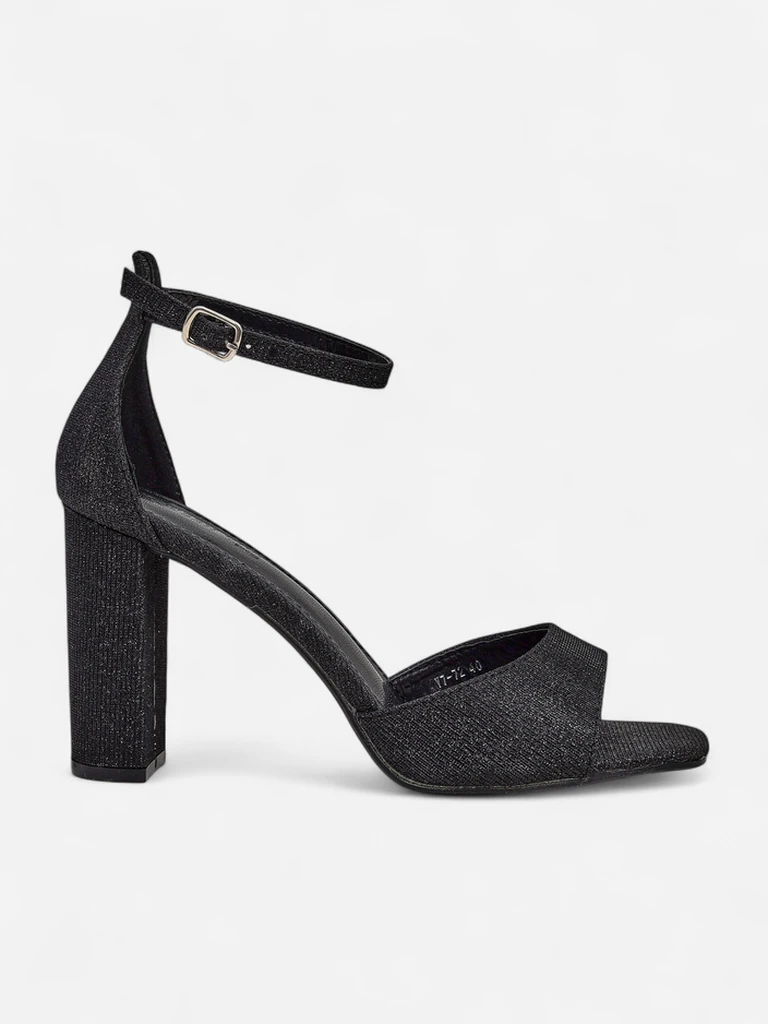 - Women's block heel sandals - the perfect idea for hot summer days. The model is made of fabric with glitter and has an eco-leather insole. The footwear features a buckle fastening. A combination of style and comfort!