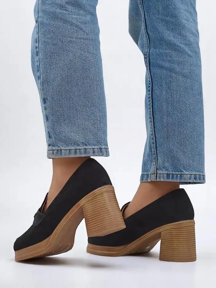 • Beautiful women’s block-heel loafers. This casual-style model is made of eco-friendly suede with an eco-leather insole. Rounded toe. An ideal base for many everyday looks!