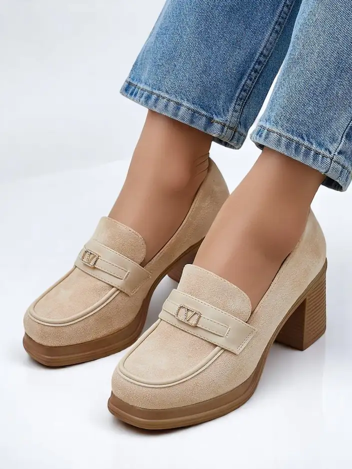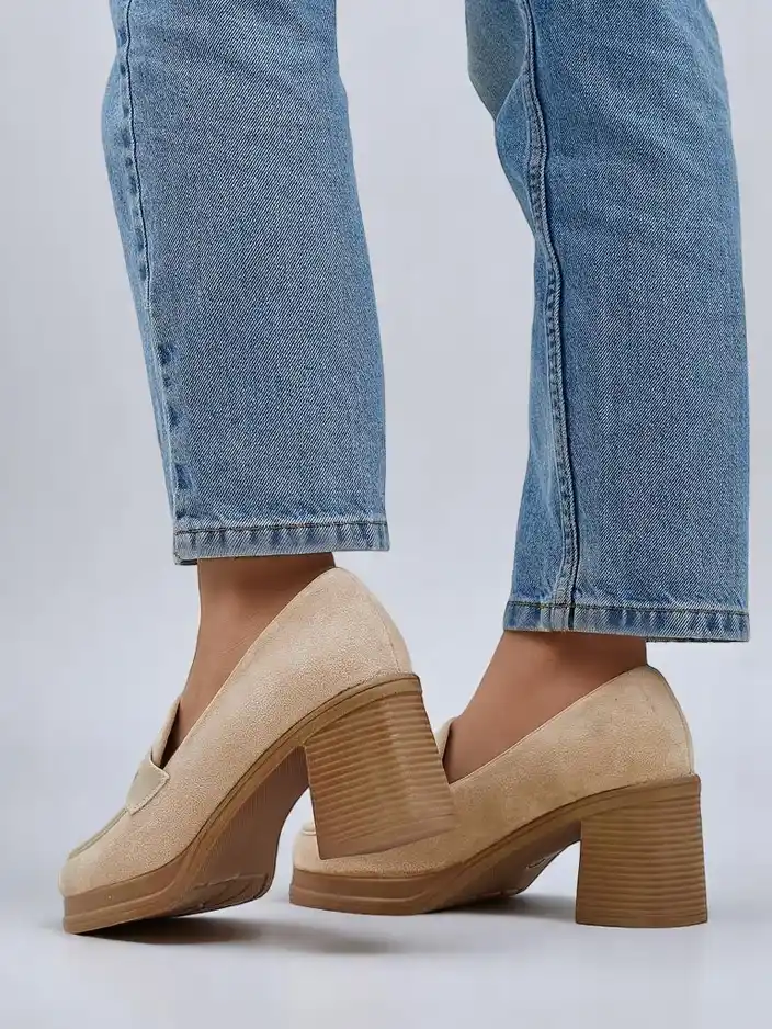 • Classic women’s heeled loafers. The model is made of suede eco-leather with an eco-leather insole. The shoes feature a subtle adornment on the upper. The perfect everyday staple!