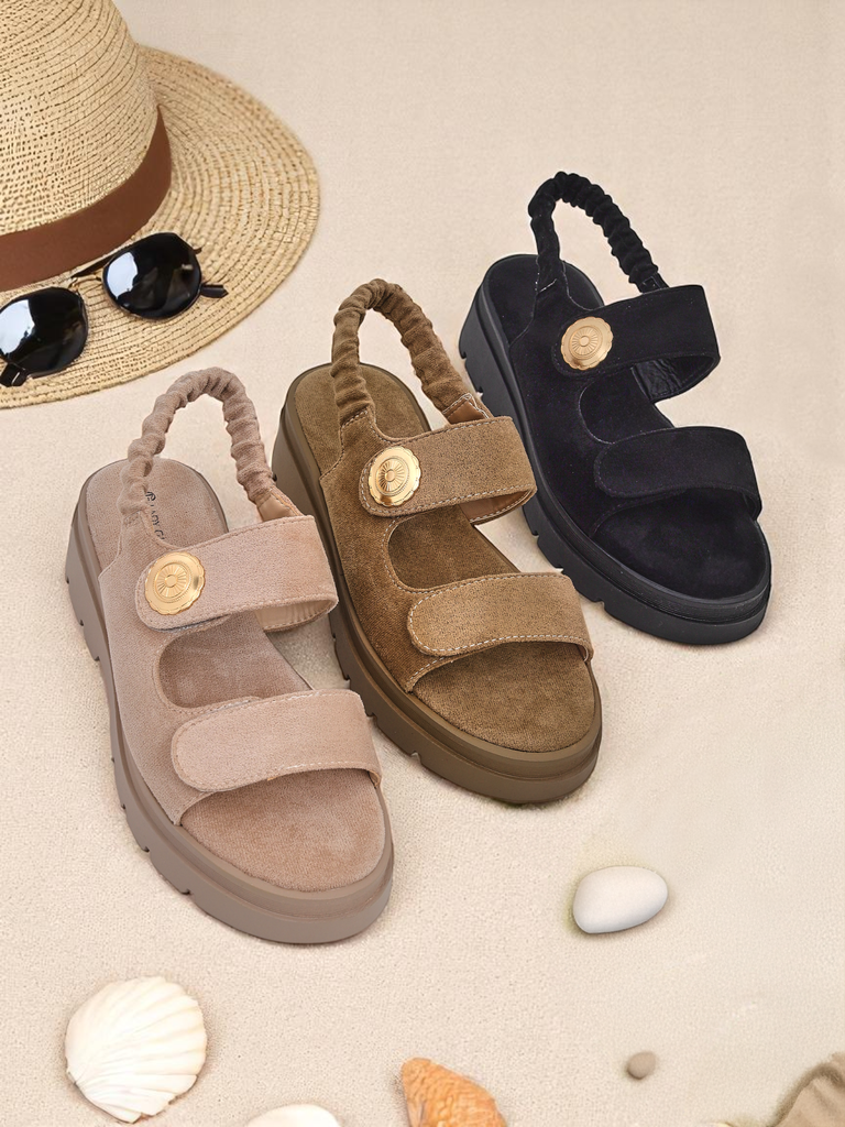 Discover lightness and exceptional comfort with Royalfashion Callista women's sandals inspired by the Italian style. The model is made of high-quality ecological suede leather, both outside and inside (insole), which ensures softness, breathability and a pleasant touch for the skin of the feet. The 5 cm high platform made of light, flexible material guarantees great cushioning and comfort even during long walks. Velcro fastening allows for quick adjustment to individual needs, and the lack of a toe ensures excellent ventilation - a perfect solution for warm days. The model is distinguished by a fashionable, minimalist design without patterns and a decorative accent resembling a coin in gold color, which adds subtle elegance to the whole. The sandals perfectly fit into current trends - a massive platform, beige shades and natural materials reign this season on catwalks and city streets.: - soft, skin-friendly eco-suede lining, - flexible sole increases wearing comfort every day, - light and stable - ideal for walks and work, - Velcro fastening allows you to quickly take off and put on shoes, - neutral, beige color matches most styles.: 1. For everyday use - combine sandals with white 7/8 jeans and an oversized linen shirt or T-shirt. 2. In boho style - combine with a summer maxi dress with flowers and a large basket bag. 3. Urban casual - choose pastel shorts and a light cardigan.: To maintain freshness and aesthetics, clean the sandals gently with a damp cloth and a suede brush. Avoid contact with water and prolonged exposure to sunlight. Store in a airy place, preferably in a cloth bag, to avoid deformation. Choose Royalfashion Callista sandals if you value modernity, comfort and timeless elegance. This model will certainly become your summer favorite, regardless of the occasion.