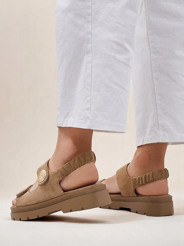 Discover lightness and exceptional comfort with Royalfashion Callista women's sandals inspired by the Italian style. The model is made of high-quality ecological suede leather, both outside and inside (insole), which ensures softness, breathability and a pleasant touch for the skin of the feet. The 5 cm high platform made of light, flexible material guarantees great cushioning and comfort even during long walks. Velcro fastening allows for quick adjustment to individual needs, and the lack of a toe ensures excellent ventilation - a perfect solution for warm days. The model is distinguished by a fashionable, minimalist design without patterns and a decorative accent resembling a coin in gold color, which adds subtle elegance to the whole. The sandals perfectly fit into current trends - a massive platform, beige shades and natural materials reign this season on catwalks and city streets.:- soft, skin-friendly eco-suede lining,- flexible sole increases wearing comfort every day,- light and stable - ideal for walks and work,- Velcro fastening allows you to quickly take off and put on shoes,- neutral, beige color matches most styles.:1. For everyday use - combine sandals with white 7/8 jeans and an oversized linen shirt or T-shirt. 2. In boho style - combine with a summer maxi dress with flowers and a large basket bag.3. Urban casual - choose pastel shorts and a light cardigan.:To maintain freshness and aesthetics, clean the sandals gently with a damp cloth and a suede brush. Avoid contact with water and prolonged exposure to sunlight. Store in a airy place, preferably in a cloth bag, to avoid deformation. Choose Royalfashion Callista sandals if you value modernity, comfort and timeless elegance. This model will definitely become your summer favorite, regardless of the occasion.