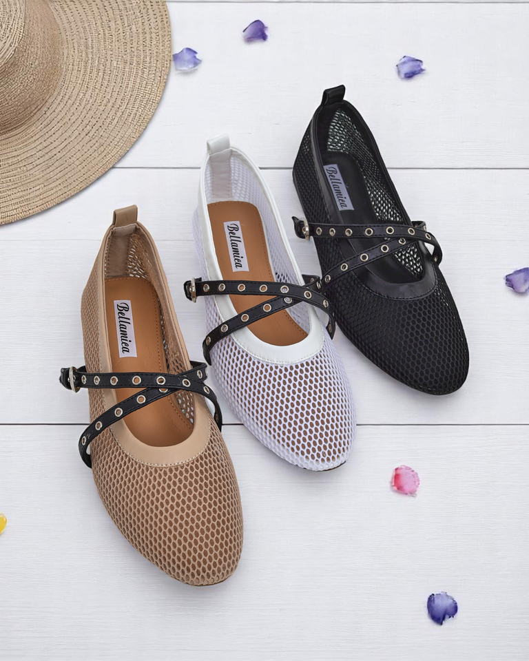 Royalfashion Calista Bianca Ballet Flats – Women's White Mesh Shoes with Black Straps