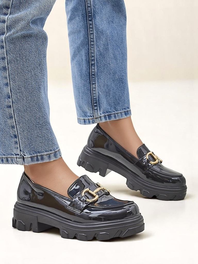 Stylish women's loafers made of patent eco-leather in an elegant black color. This model stands out with a massive, lugged sole that provides wearing comfort and excellent grip. At the front, there is a gold horsebit-style decoration that gives the shoes a chic character. The interior is lined with a soft material, which increases wearing comfort. Ideal for both casual and more elegant outfits. An excellent choice for the autumn-spring season.