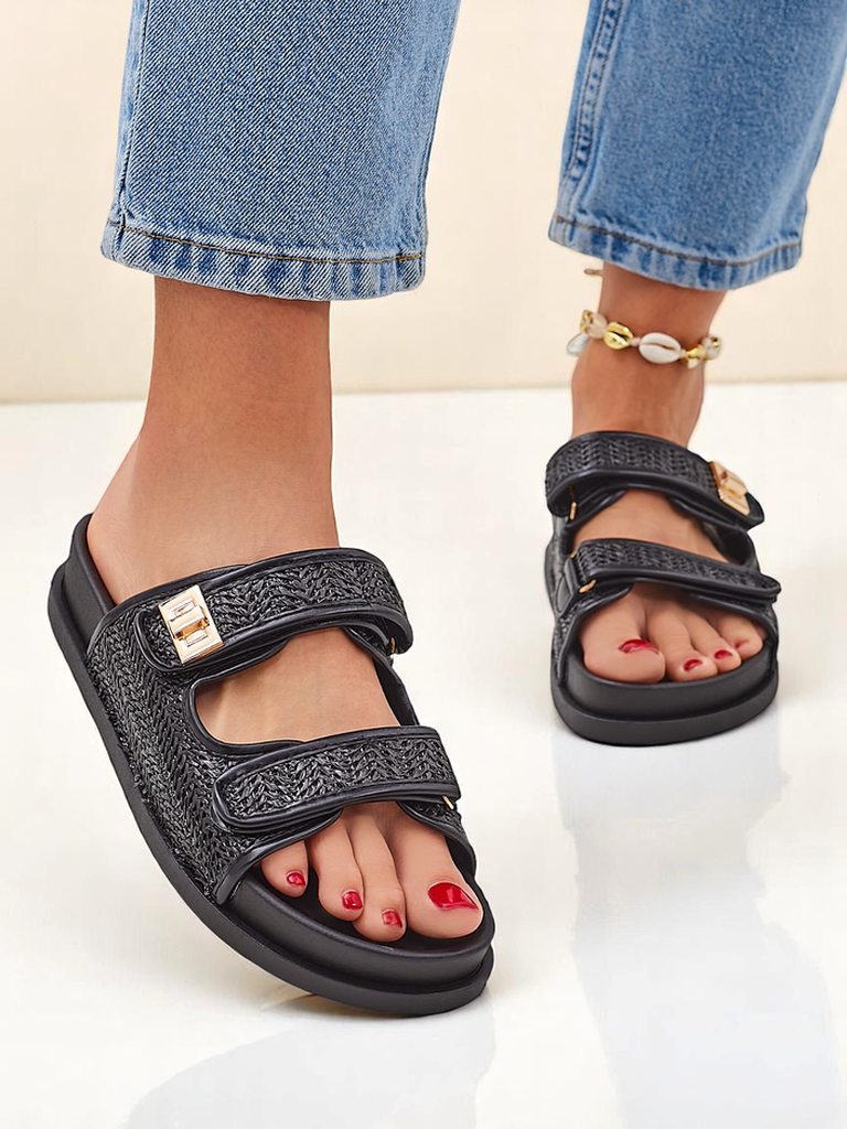• Beautiful women's straw slip-on sandals with plastic buckles and a rubber sole. They feature adjustable Velcro straps and are perfect for summer outfits!