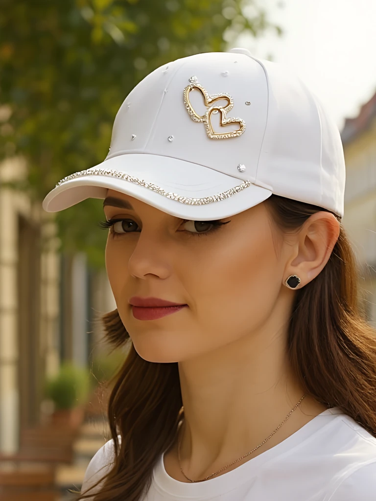 - Feminine cap decorated with rhinestones in the shape of hearts. Stylish, comfortable, and adjustable. Adds sparkle to both everyday and special outfits!