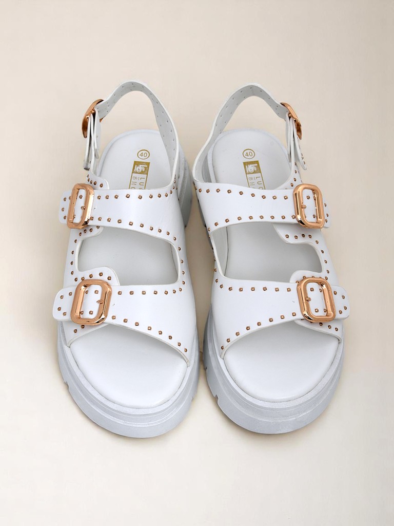 - Women's eco-leather sandals on a thick sole, decorated with shimmering rhinestones. Fastened with a buckle, they combine comfort with a distinctive, modern style.