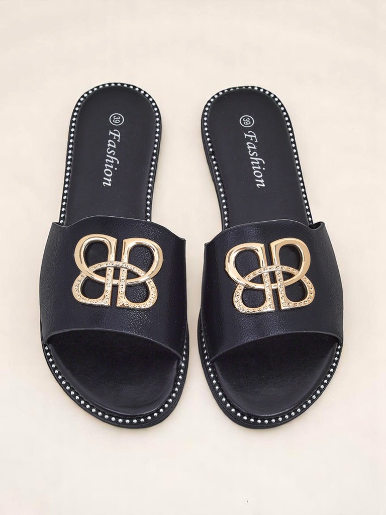 - Stylish eco-leather flip-flops on a flat sole, decorated with a gold ornament. Everyday comfort and elegance that will add sparkle to any summer styling.