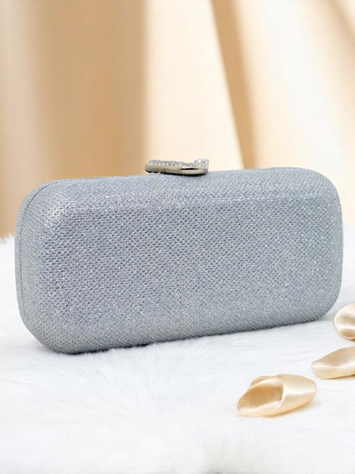 • Envelope handbag made of eco-leather covered with a shiny fabric with delicate embossing. Closes with a snap, with a detachable chain—perfect for an elegant evening.