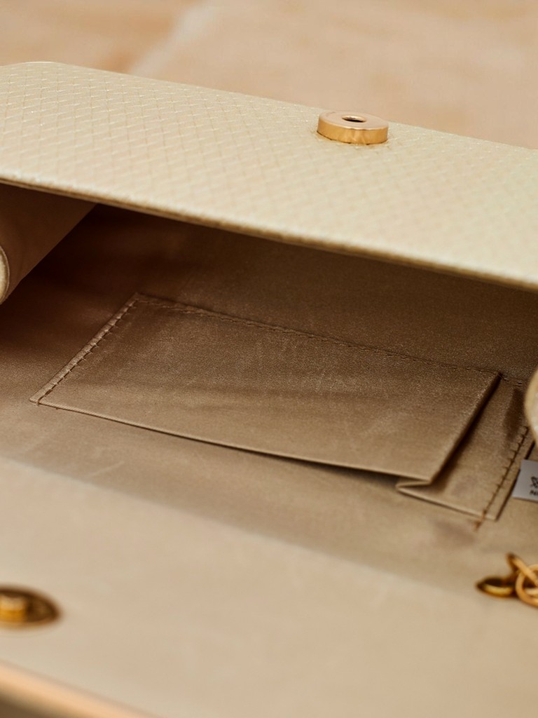 • Envelope handbag made of eco leather, covered with fabric with a shimmering thread and delicate embossing. Fastened with a magnet, with a detachable strap – perfect for evening outings.