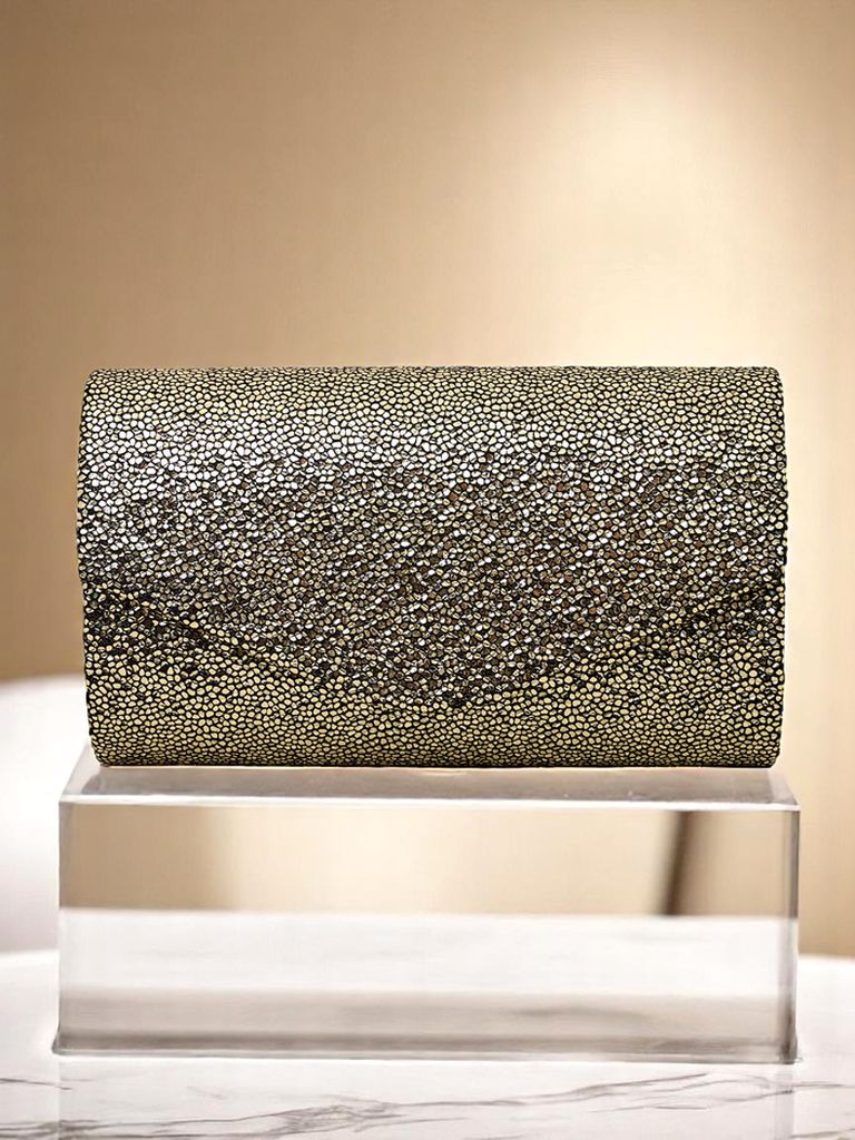 • Shiny clutch bag made of eco-leather covered with thick glitter. Fastened with a magnet, with a detachable strap—perfect for an evening full of glamour and style.
