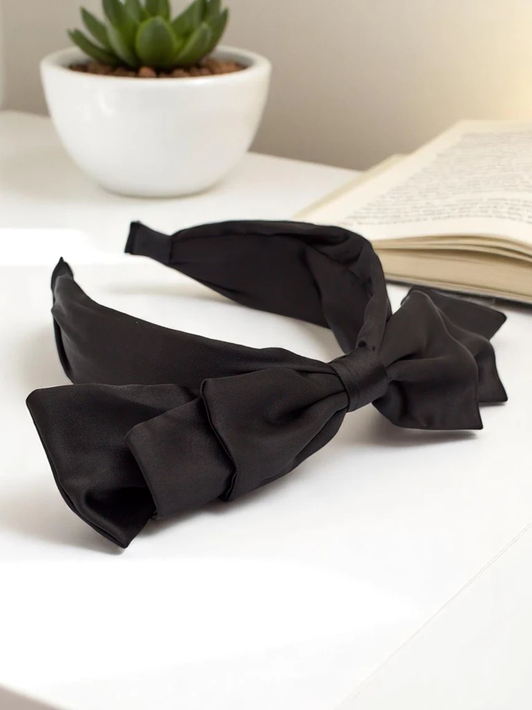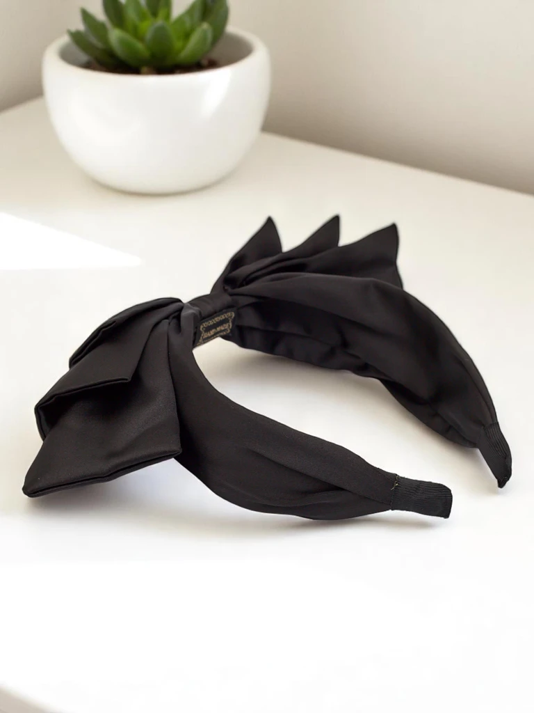 - The satin hairband with a bow is an elegant and feminine accessory that will add charm to any outfit. The soft, shiny material drapes beautifully, and the decorative bow attracts attention. Perfect for everyday wear and special occasions.