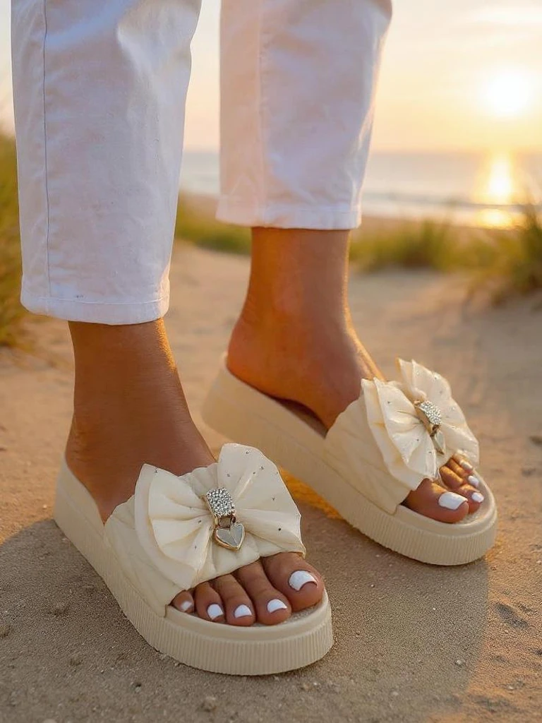 Florensis Bella are elegant women's platform flip-flops that stand out with their subtle, creamy colors and a large, decorative bow with a shimmering application. The upper is made of high-quality textile material, gently shimmering and velvety to the touch, while the insole and sole are made of durable EVA material - guaranteeing comfort and lightness when worn. This material is non-slip, resistant to moisture and easy to clean, which has gained numerous safety certificates applicable to casual footwear. The main advantages of the product are the raised, corrugated sole, which visually lengthens the legs, and the soft insole ensuring comfort throughout the day. A large, decorative bow is placed on a wide strap, which stabilizes the foot and adds elegance at the same time - a jewelry element with crystals and a heart attracts the eye and emphasizes the feminine character of the flip-flops. These flip-flops work great in three different styles: 1. Romantic look for a date: combine with a pastel maxi dress or a flared skirt and a light blouse. 2. Urban style: match with short denim shorts and a white oversized T-shirt. 3. Casual for the beach: pair with airy palazzo pants and a tank top. Florensis Bella fits into the current 'girly chic' and 'pastel soft' trends that dominate this summer. Their subtle elegance and original detail with the application make each styling take on a unique character - even the most minimalist look. Cleaning the flip-flops is quick and easy: just a damp cloth with a mild detergent. Do not dry directly in the sun or near radiators - it is recommended to dry in the shade, at room temperature. Store in a dry place, away from sharp objects to avoid damaging the textile material and decorations. Florensis Bella is a combination of comfort, style and current fashion trends - an irreplaceable choice for summer days, a walk, a trip or a meeting with friends.