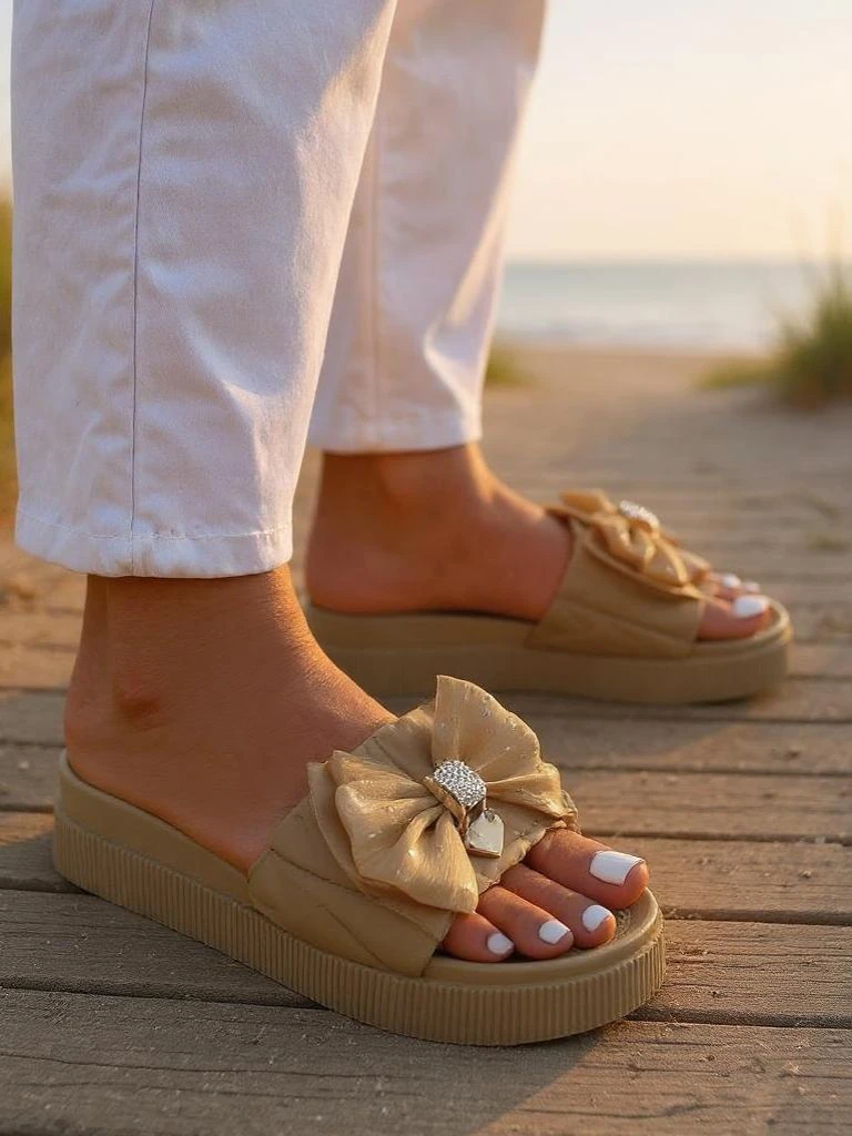 - Women's flip-flops on a light, rubber platform, perfect for summer days. The eco-leather strap decorated with a charming bow adds a girlish charm. Comfortable, stylish, and feminine - a great choice for everyday outings and vacation relaxation.
