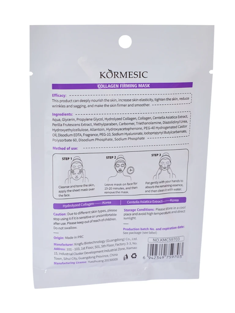 • A firming sheet face mask with collagen intensely moisturizes, smooths, and improves skin elasticity. It has a lifting effect, reduces signs of fatigue, and restores a youthful glow to the complexion. Perfect for express care.