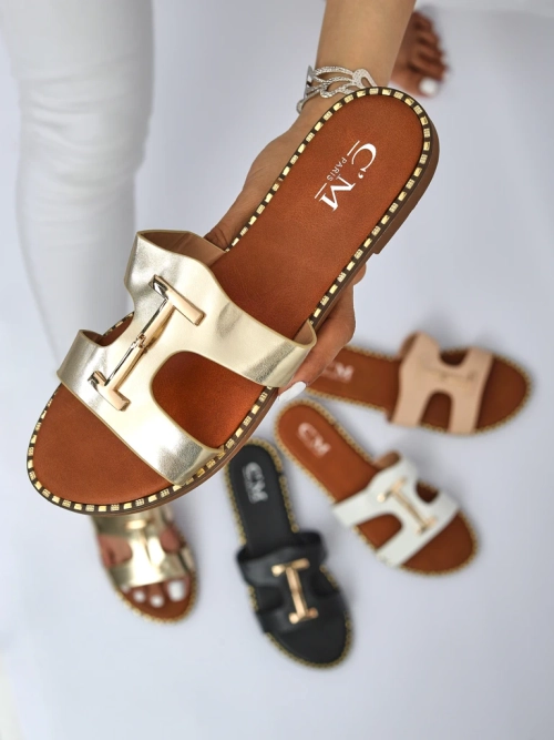- Women's sandals made of eco leather with a flat sole, featuring trendy braiding and a golden ornament. Stylish and comfortable, perfect for summer. The lightweight construction and elegant accent add chic to any everyday outfit.