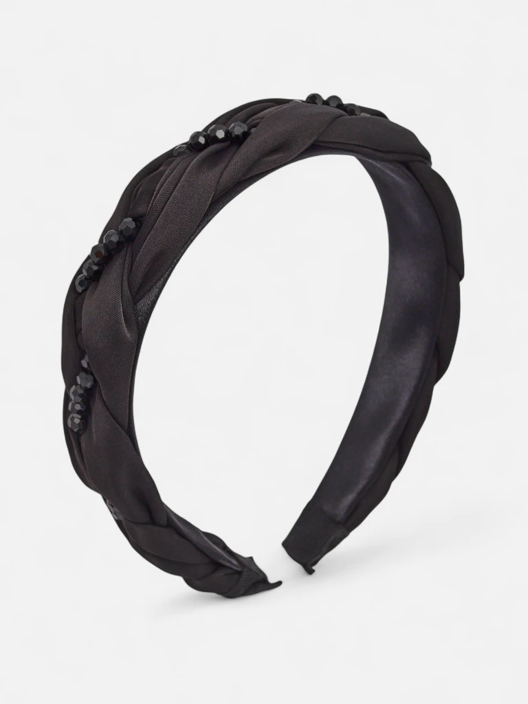 - Elegant hairband with an impressive braid-style weave, adorned with subtle pearls. Ideal for special occasions and stylish outings. Comfortable and stable, it adds class, feminine charm, and a chic finish to hairstyles.