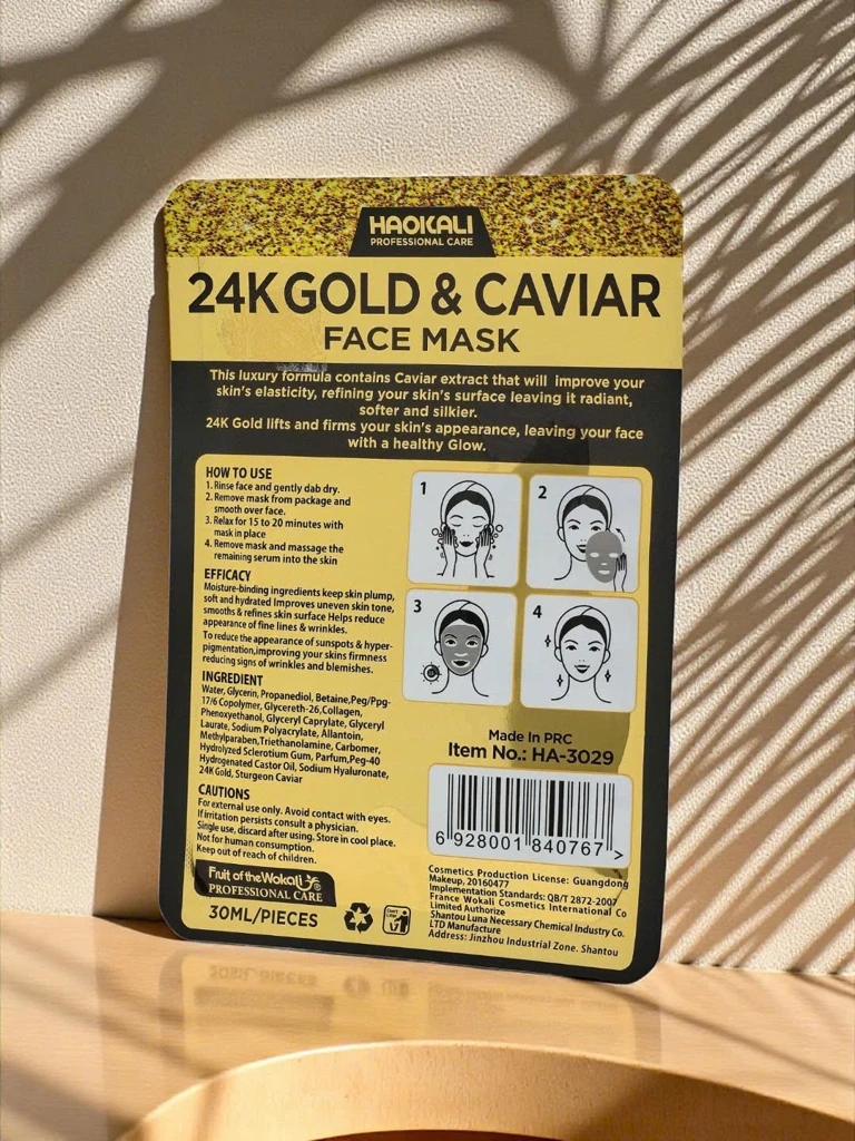 - Sheet mask with 24K gold and caviar – intensely nourishes, firms, and illuminates the skin. Smoothes, moisturizes, improves elasticity, and regenerates. Protects against aging and soothes irritations. Ideal for demanding skin care.