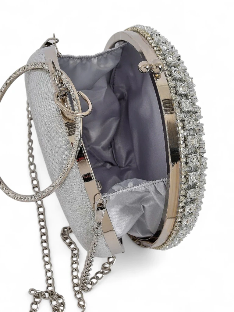 • Round clutch with an intricately decorated surface of cubic zirconia. The chain allows you to wear it on your shoulder. Elegant, expressive, and created to shine after dark.