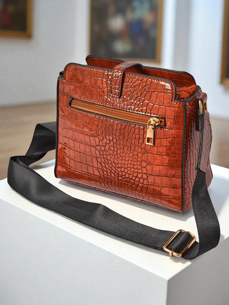 • Patent faux leather handbag with elegant embossing. 1 spacious compartment and a detachable, adjustable strap ensure comfortable carrying. A stylish choice for everyday and special occasions. Class that attracts attention.