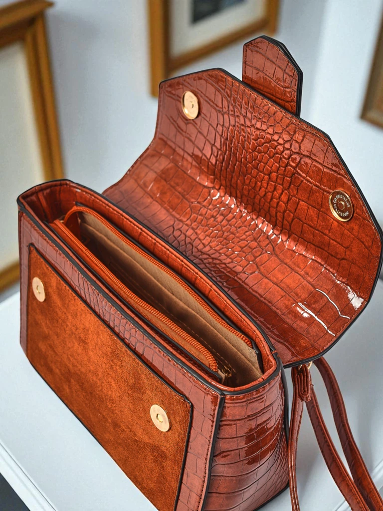 The Callista handbag is a combination of sophisticated style and a modern approach to ecology. It is made of high-quality ecological leather and suede eco-leather, which not only reflect the natural texture but are also environmentally friendly. The production process of these materials is based on reducing the use of chemicals and water consumption, which confirms their pro-ecological character. The suede front of the handbag delights with its softness to the touch, while the crocodile-textured eco-leather surfaces add luxury and character to the entire form. Gold fittings and a solid zipper combined with a magnet ensure the safety of stored items. The interior of the handbag has been thoughtfully planned - numerous pockets and space division allow you to conveniently organize the most necessary accessories, such as a phone, wallet or keys. The Callista model is dedicated to women who value comfort, aesthetics and modern solutions. The most important advantages of the Callista handbag: - Lightweight construction and compact size (24x16x10 cm) make it perfect for everyday outings and meetings. - Ecological materials guarantee durability, ease of cleaning and resistance to damage. - The universal, dark brown color fits into current fashion trends and matches many styles. Styling proposals: 1. Casual set: fitted jeans, a white t-shirt, a caramel coat and a Callista handbag - the perfect look for shopping and meeting friends. 2. Business chic: a pencil skirt, a silk shirt and high heels - an elegant handbag will complement the office look for an important business meeting. 3. Boho style: a flowing dress, cowboy boots and a long cardigan - Callista will add lightness and modernity to any summer styling. How to care for the handbag: - Clean with a damp cloth with a mild detergent designed for eco-leather and suede. - Store in a ventilated place, preferably with filling inside to protect the shape. - Avoid prolonged exposure to sunlight and contact with water. The Callista handbag fits into the latest trends of the season - the combination of classic brown and the duet of suede and crocodile-like leather structure is noticeable on world catwalks. It is a must-have for every modern woman who values style and functionality.