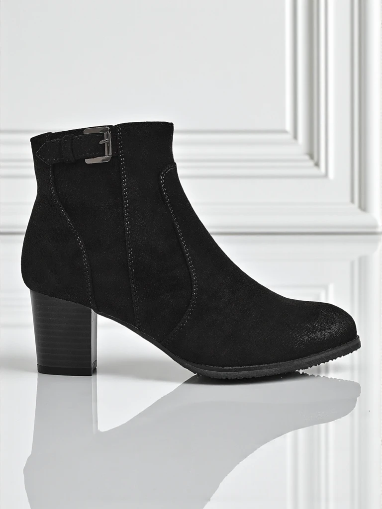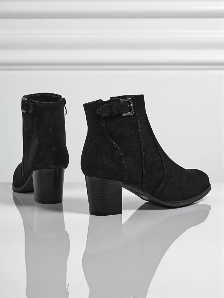 • Fantastic women's heeled ankle boots, made of eco-suede leather. The interior is made of delicate fur. The model fastens with a zipper. They have decorative buckles. Perfect for autumn outfits!