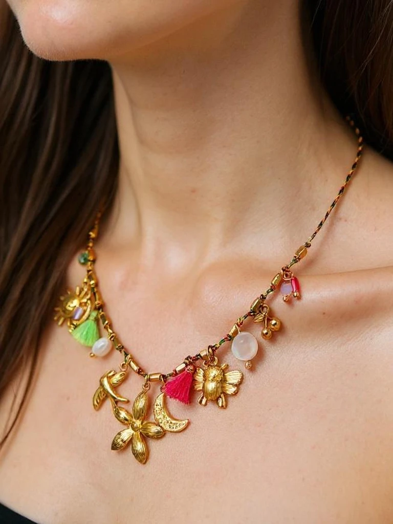 - The Aurora Floralis necklace with charms and pearls is a unique piece of boho-style jewelry, perfect for any occasion.