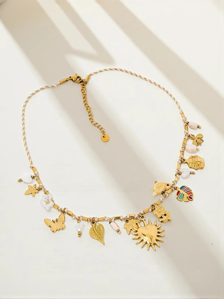 Discover the unique Aurelia Charis necklace, distinguished by its rich details and careful craftsmanship. This model is made of high-quality precious metal alloy, coated with a durable, hypoallergenic galvanic coating in a gold shade, which ensures a beautiful shine and resistance to abrasion. The decorative elements are small pendants with botanical and symbolic motifs: leaves, butterflies, sun, heart, or colorful monstera, each precisely formed, partially covered with enamel and decorated with glass beads and synthetic pearls. This necklace is lightweight, comfortable and skin-friendly, does not contain nickel or allergenic substances, which is confirmed by appropriate quality certificates. The unique advantages of the product are the originality of the design, the possibility of adjusting the length, and the versatility thanks to the combination of gold with colorful details. It is perfect for both everyday wear and evening stylizations. How to wear Aurelia Charis? 1. Pair it with a white linen shirt and mom-fit jeans to add freshness to your styling. 2. Combine with a flowing boho maxi dress and wedge sandals - the perfect look for summer festivals. 3. Wear the necklace with an elegant jumpsuit or simple black dresses to add a touch of artistic extravagance. To enjoy the shine of the necklace for a long time, store it in a separate bag or box, avoiding contact with water, perfumes and detergents. Clean gently with a soft cloth. If dust or dirt appears, simply wipe with a slightly damp cloth and leave to dry. Boho fashion is once again reigning on world catwalks, and jewelry with eye-catching pendants is an absolute must-have. The Aurelia Charis necklace perfectly fits into these trends, combining natural motifs with an expressive form. It is a great choice for people who value originality and a free style.
