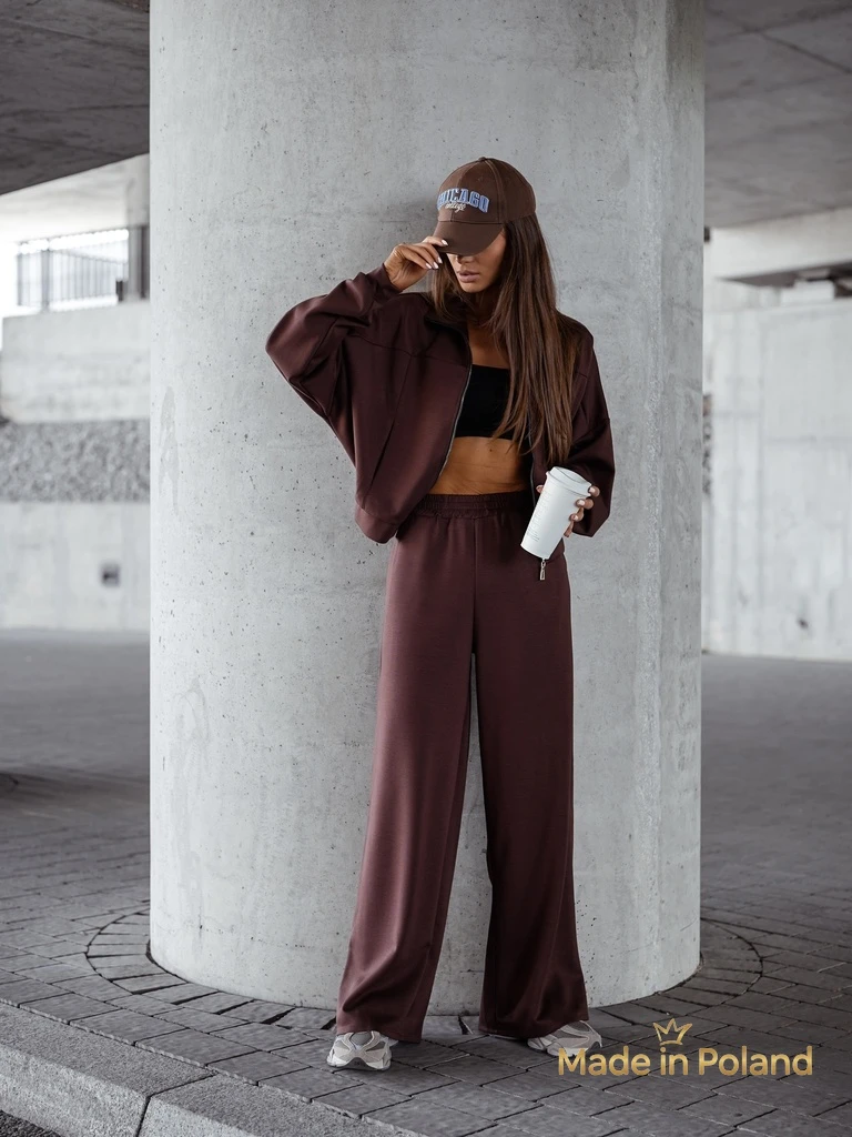 - Women's tracksuit set made of pleasant viscose material. Zip-up sweatshirt. Long, wide trousers with elastic at the waist and ankles, with 2 pockets. Feel the style in this wonderful set!