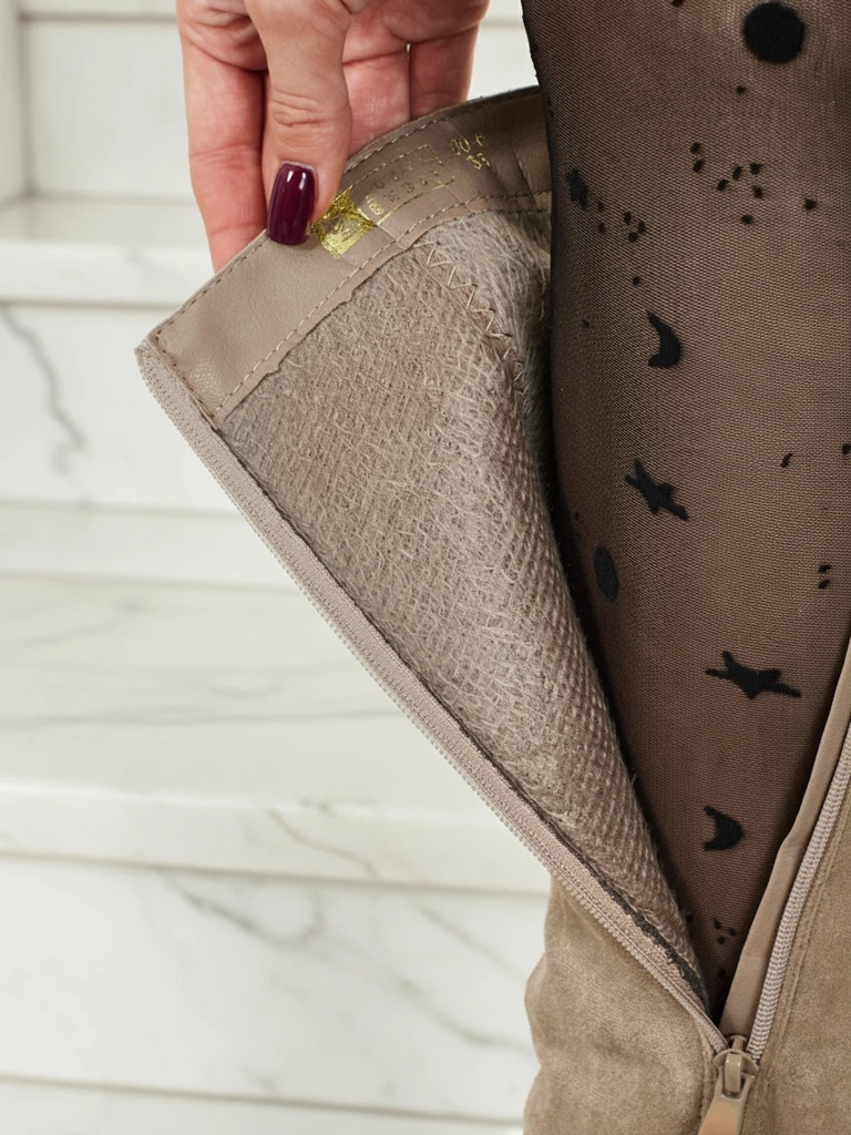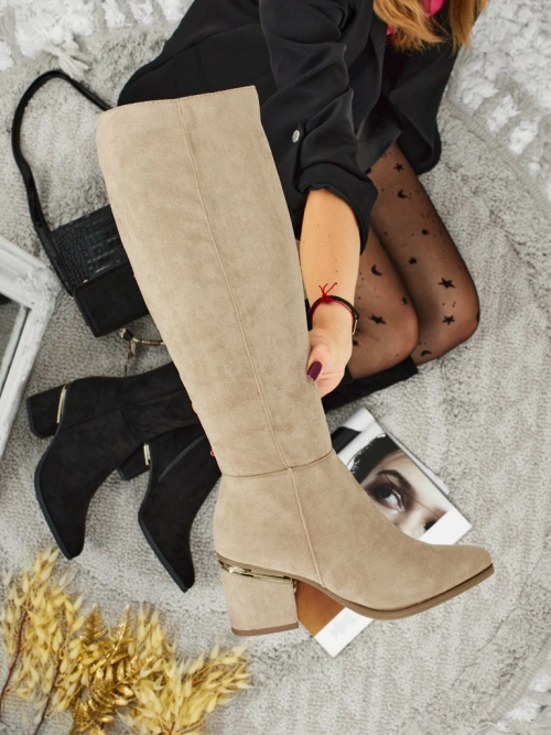 - Stylish women's knee-high boots with a block heel. The upper is made of eco-suede leather, with a fur lining inside. The model is fastened with a zipper. Perfect for everyday autumn outfits!
