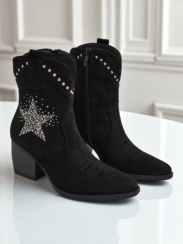 - Ankle cowboy boots with heels, made of ecological suede leather. Fabric insole, boots fastened with a zipper and decorated with a rhinestone star. They match many feminine styles!