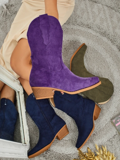 - Ankle cowboy boots with a flat heel, made of ecological suede leather. Fabric insole, zip fastening. They match many feminine styles!