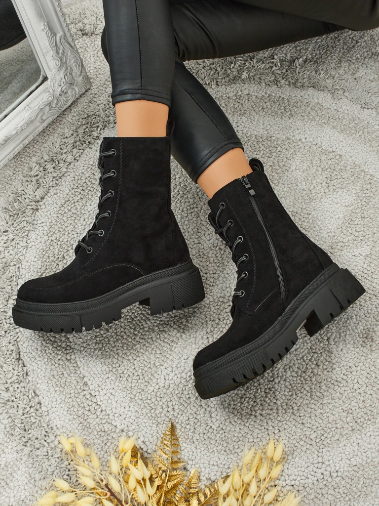 - Women's high worker boots made of eco-suede, laced and zippered. Model on a higher sole, with delicate fur inside. The perfect choice for colder weather!