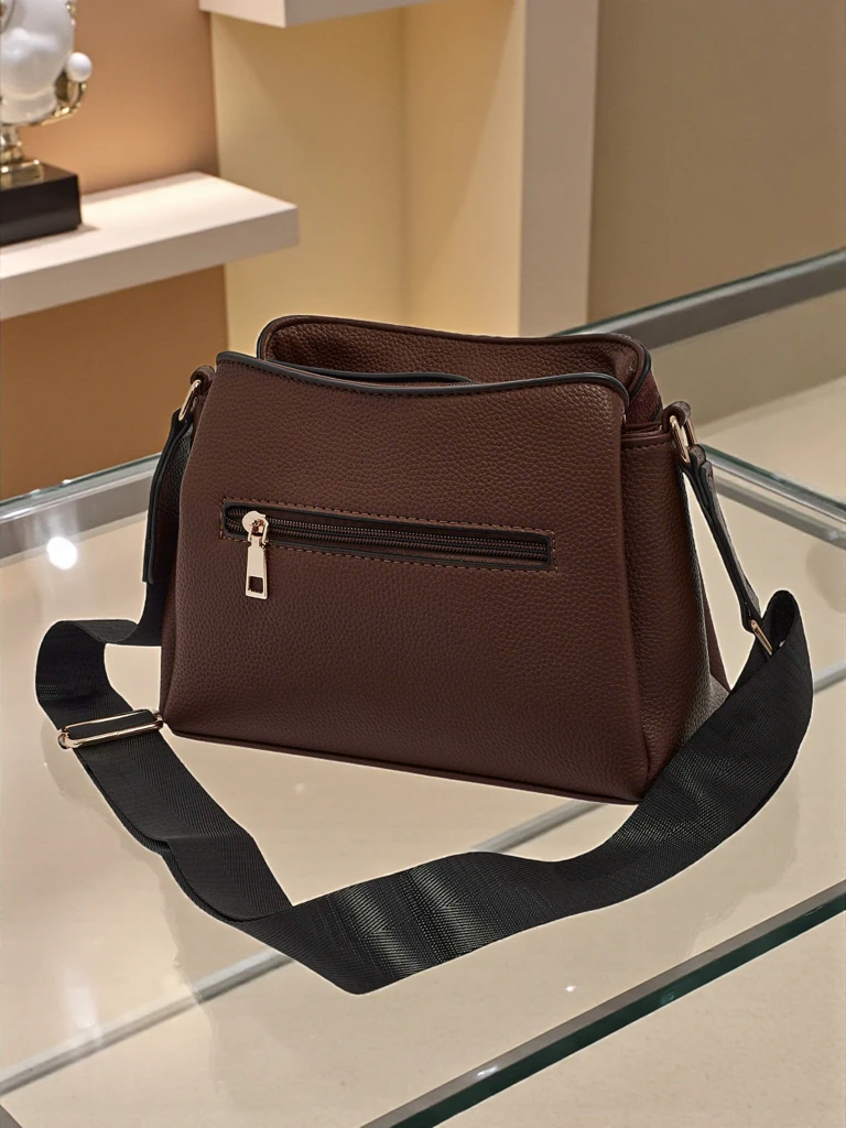 - Small handbag made of a combination of eco-leather and eco-suede. 3 compartments, 3 pockets, zipper and adjustable strap. Style and functionality in perfect edition.