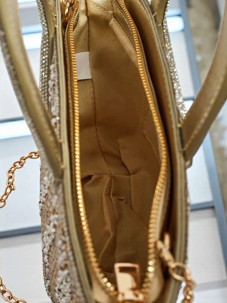 • A dazzling small women's handbag adorned with cubic zirconia. Features a zipper closure, handles, and a detachable chain. Perfect for evening outings - small, phenomenal, and full of sparkle!