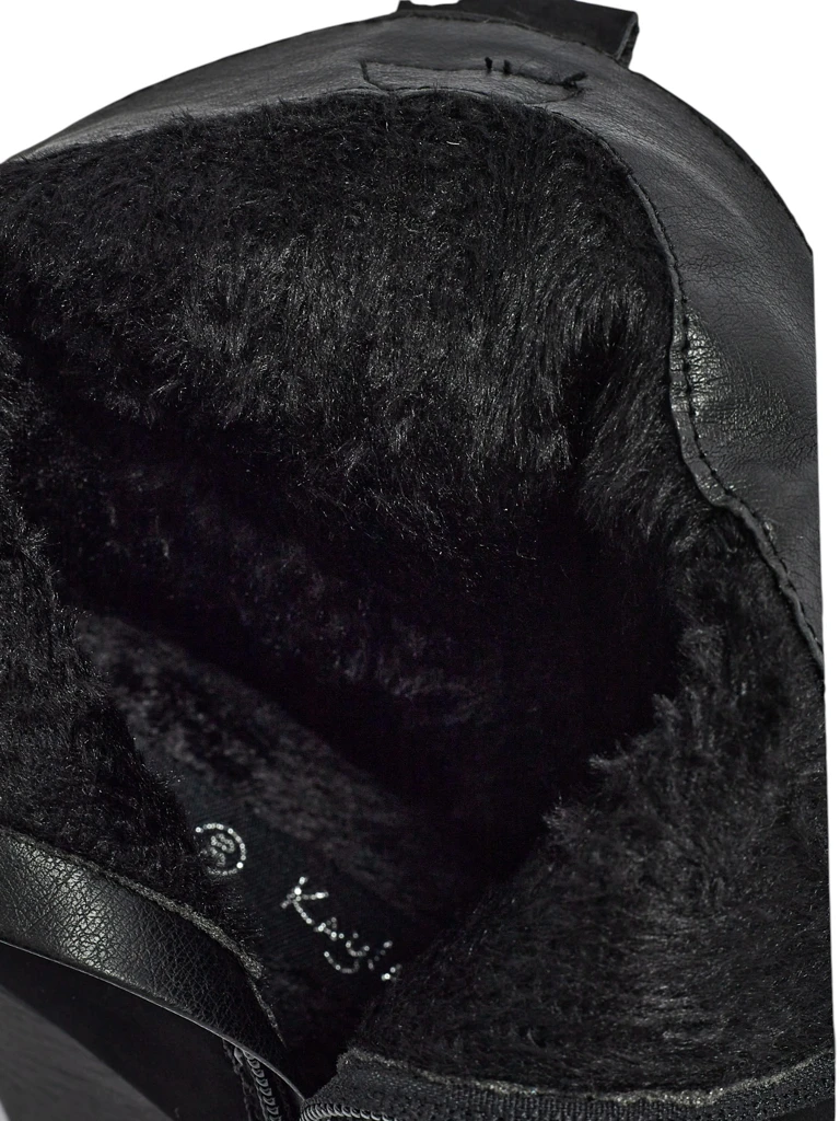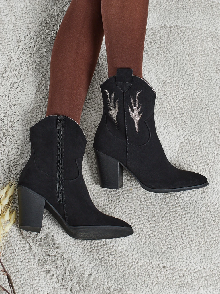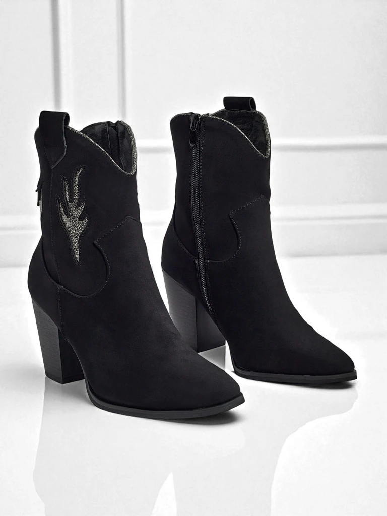 - Ankle cowboy boots with heels, made of matte ecological leather. The inside is insulated with fur, and the boots are fastened with a zipper with decorative glitter inserts. They match many feminine styles!
