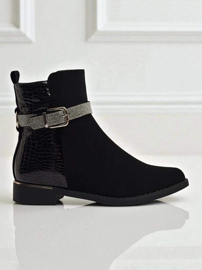 - Women's ankle boots with a zipper. The model is made of a combination of matte and patent eco-leather, on a flat sole. It has a faux fur lining. Decorated with rhinestones. Comfortable and stylish, perfect for autumn!