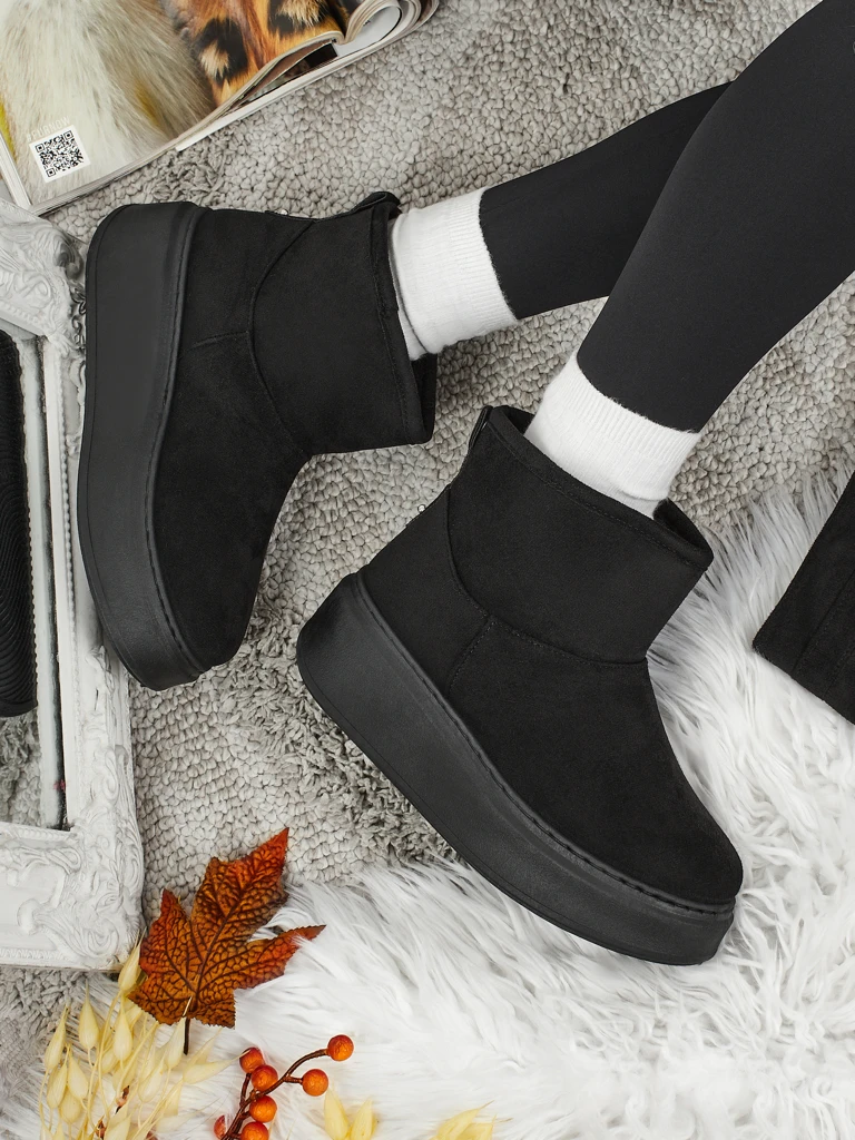 - Great women's winter snow boots on a thick platform sole. The upper is made of ecological suede leather, the inside is insulated with fur. They also have a detachable upper. The perfect base for winter!
