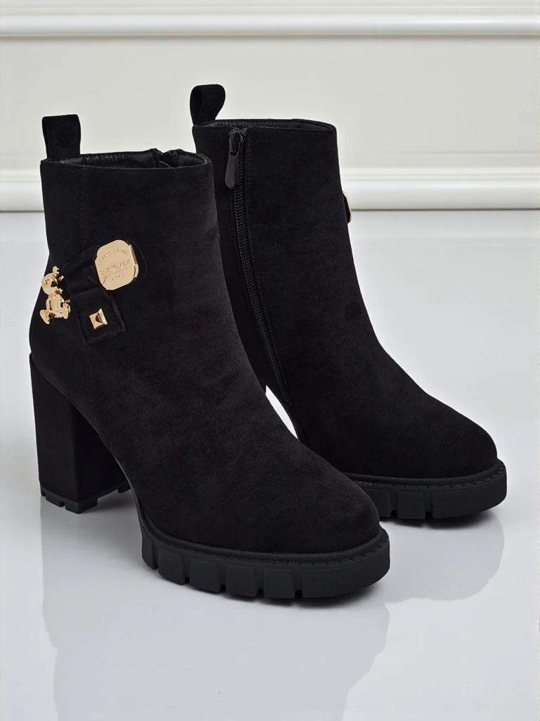 - Comfortable heeled ankle boots, made of eco-friendly suede leather. The model is fastened with a zipper. The model is gently insulated with fur and has a gold decoration on the side of the upper. The perfect choice for autumn!