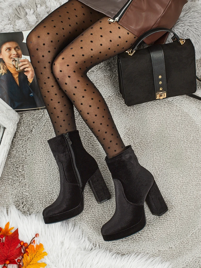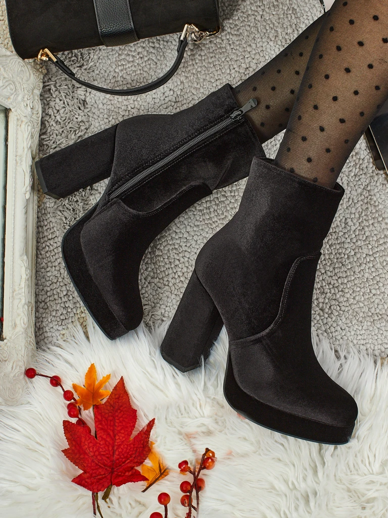 - Comfortable heeled ankle boots, made of a velour-like fabric. The model fastens with a zipper. It has a delicate lining in the form of fur. An ideal choice for autumn!