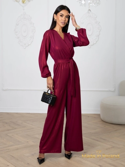 - Elegant women's jumpsuit made of pleasant fabric with a glitter thread. Top with a wrap neckline and long sleeves. Wide legs with elastic at the waist. Additionally, a belt. Perfect for those who value comfort.